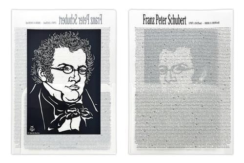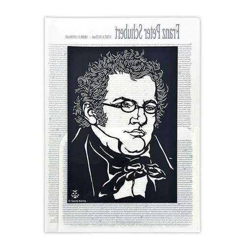 クラシック音楽の作曲家シューベルトが描かれた、栗田大地氏の切り絵風デザインのA4クリアファイル。